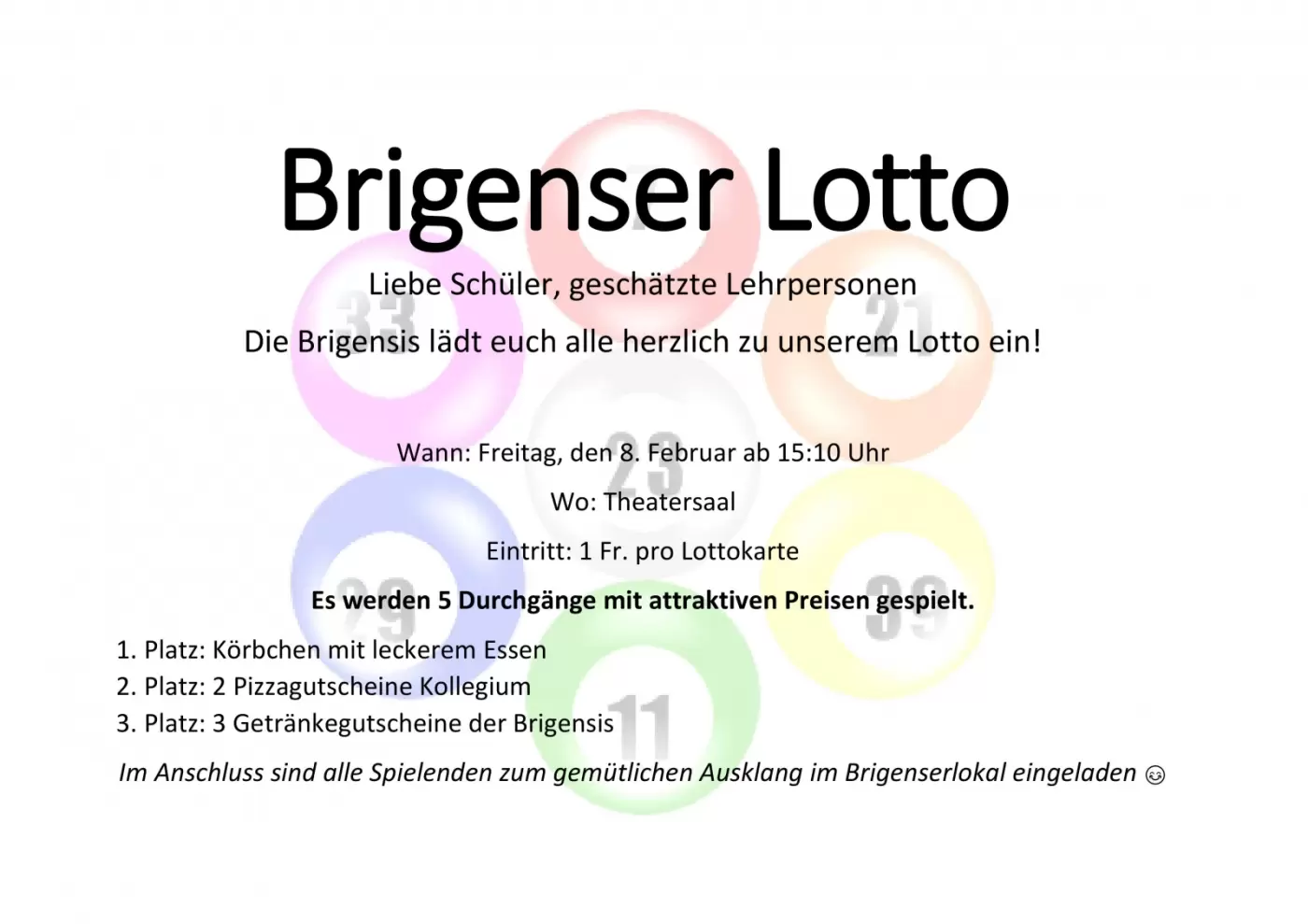 Die Sectio Brigensis führt am Freitag, 08.02.2019 ab 15:10 Uhr im Theatersaal für die interessierte Schüler- und Lehrerschaft ein Lotto durch. Es werden 5 Durchgänge gespielt und es warten lukrative Preise auf die Teilnehmenden. Im Anschluss findet ein gemütlicher Ausklang im Lokal der Brigensis statt.
