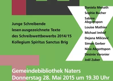 Am 28.5.2015 um 19:30 Uhr findet in der Bibliothek in Naters eine Lesung mit den Preisträgerinnen und Preisträgern des Schreibwettbewerbs statt. Der Anlass wird musikalisch begleitet. Der Eintritt ist frei.