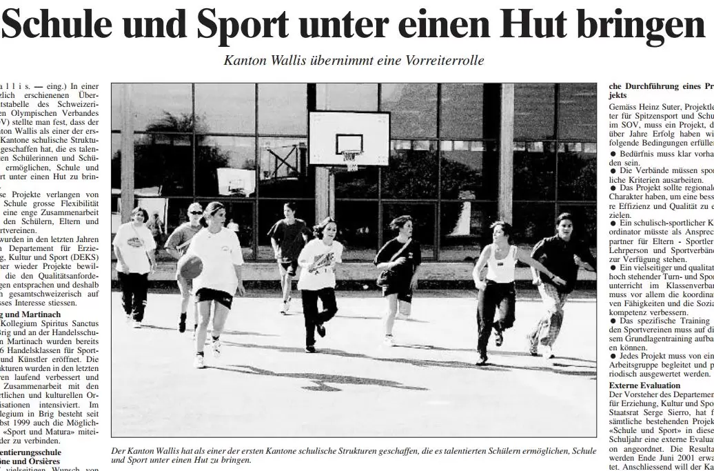 In einer kürzlich erschienenen Übersichtstabelle des Schweizerischen Olympischen Verbandes (SOV) stellte man fest, dass der Kanton Wallis als einer der ersten Kantone schulische Strukturen geschaffen hat, die es talentierten Schülerinnen und Schülern ermöglichen, Schule und Sport unter einen Hut zu bringen. [...]