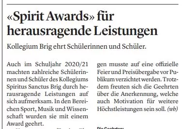 Auch im Schuljahr 2020/21 machten zahlreiche Schülerinnen und Schüler des Kollegiums Spiritus Sanctus Brig durch herausragende Leistungen auf sich aufmerksam. [...]